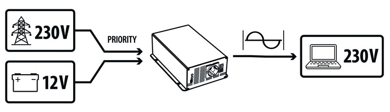 Circuito di priorità della rete 230 V integrato: Non appena è disponibile l'alimentazione da terra a 230 V (ad esempio dal campeggio), il funzionamento dell'inverter viene interrotto automaticamente.